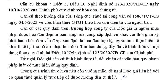 Xin chào Quý Bộ Tôi tên là Nguyễn Thế Hải, hiện là kế toán tại doanh nghiệp có trụ sở tại Tổ dân phố Hồng Sơn, phường Kỳ Phương, thị xã Kỳ Anh, tỉnh Hà Tĩnh; Công ty tôi đang làm việc khai thuế GTGT theo phương pháp khấu trừ và kê khai theo quý. Mong Quý Bộ hướng dẫn kê khai thuế GTGT theo Công văn số 4943/TCT-KK ngày 23/11/2015 của Tổng Cục thuế như sau: Ngày 30/06/2024 đơn vị bán hàng có ký phát hành cho Công ty tôi một hóa đơn GTGT (gọi tắt là hóa đơn A). Ngày 01/07/2024 Công ty tôi đã nhận được đầy đủ hàng hóa về hồ sơ kèm theo hóa đơn A, thực hiện hạch toán ghi sổ nghiệp vụ pháp sinh liên quan đến hóa đơn trên. Theo nội dung hướng dẫn tại ví dụ 5, điểm a, khoản 3 Công văn 4943/TCT-KK ngày 23/11/2015 của Tổng Cục thuế hướng dẫn Luật thuế GTGT; Thông tư số 219/2013/TT-BTC ngày 31/12/2013 của Bộ Tài chính, tôi kê khai hóa đơn A trên vào Mục I - Hàng hóa, dịch vụ mua vào trong kỳ” trên tờ khai 01/GTGT của kỳ tính thuế Quý 03/2024. Xin hỏi tôi kê khai như vậy đã đúng quy định chưa ? Xin chân thành cảm ơn !