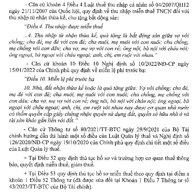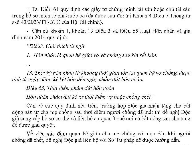 Tôi muốn hỏi, cơ quan thuế địa phương áp dụng Điều 65 Luật hôn nhân và Gia đình phủ nhận mối quan hệ con dâu, bố mẹ chồng khi tôi vẫn đang chung sống, là thành viên trong gia đình, chưa đăng ký kết hôn tiếp với bất kỳ ai; phủ nhận xác nhận thông tin cư trú, cơ sở dữ liệu quốc gia của công an, xác nhận của UBND địa phương có đúng chính sách, quy định hay không? Trường hợp của tôi có được miễn thuế TNCN, LPTB khi tặng cho bất động sản hay không?