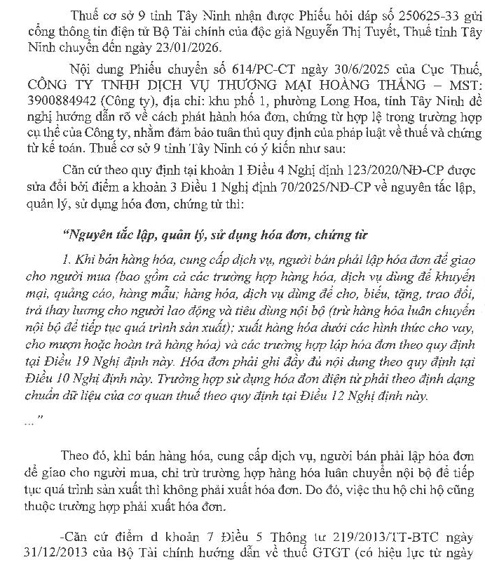 Xin hướng dẫn về việc phát hành hóa đơn trong hoạt động thanh toán hộ liên quan dịch vụ xuất nhập khẩu : Kính gửi Quý Bộ Tài Chính, Công ty chúng tôi hoạt động trong lĩnh vực dịch vụ xuất nhập khẩu, gồm: mở tờ khai, làm thủ tục hải quan, vận chuyển hàng hóa và các dịch vụ liên quan. Trong quá trình hoạt động, các khoản phí như local charge và phí nâng/hạ container thường phát sinh ngoài giờ hành chính, đặc biệt là vào buổi đêm. Khi đó, tài xế đến lấy/hạ container và phải thanh toán ngay để thực hiện thủ tục lấy hàng, nhằm đảm bảo tiến độ vận chuyển. Tuy nhiên, theo quy định tại Luật thuế giá trị gia tăng số 48/2024/QH15, các khoản thanh toán bắt buộc phải thực hiện bằng hình thức không dùng tiền mặt và có chứng từ hợp lệ. Do đó, tôi xin hỏi Bộ Tài Chính về giải pháp hợp lệ cho các trường hợp sau: Cụ thể: - Bên khách hàng có hợp đồng với bên Công ty chúng tôi và ủy quyền cho bên Công ty chúng tôi thanh toán hộ các chi phí phát sinh như trên bằng chuyển khoản từ tài khoản Công ty, sau đó Bên Công ty chúng tôi có ký hợp đồng nguyên tắt với bên nhà xe vận chuyển và ủy quyền lại nhà xe thanh toán hộ các chi phí này , sau đó nhà xe ủy quyền cho tài xế/ nhân viên bên nhà xe bằng chuyển khoản từ tài khoản công ty/ hoặc cá nhân cho tài xế, sau đó các tài xế khi lấy/hạ Container sẽ thanh toán các phí nâng hạ container cho bên Cảng bằng tài khoản cá nhân , tôi muốn hỏi : + Là bên Nhà xe cũng phải Chuyển khoản cho tài xế/nhân viên của mình từ Tài khoản Công ty họ qua tài khoản cá nhân tài xế/ nhân viên phải không ? + Khi Cảng ra hóa đơn : Là cảng vẫn xuất hóa đơn thẳng cho Khách hàng của chúng tôi luôn thì được không ? hay phải xuất hóa đơn cho nhà xe rồi nhà xe xuất lại cho bên Công ty chúng tôi, sau đó Công ty chúng tôi phải xuất hóa đơn lại cho Khách hàng ? và khi xuất hóa đơn thì chi phí từ lúc Cảng phát hành hóa đơn ví dụ 700.000vnđ ( chưa VAT) thì cuối cùng Công ty chúng tôi phải xuất lại cho khách hàng của mình cũng là 700.000vnđ ( chưa VAT) phải không ? Kính mong Quý Bộ hướng dẫn rõ về cách phát hành hóa đơn, chứng từ hợp lệ trong trường hợp cụ thể của công ty chúng tôi, nhằm đảm bảo tuân thủ quy định của pháp luật về thuế và chứng từ kế toán. Xin chân thành cảm ơn Quý Bộ đã quan tâm, hỗ trợ.