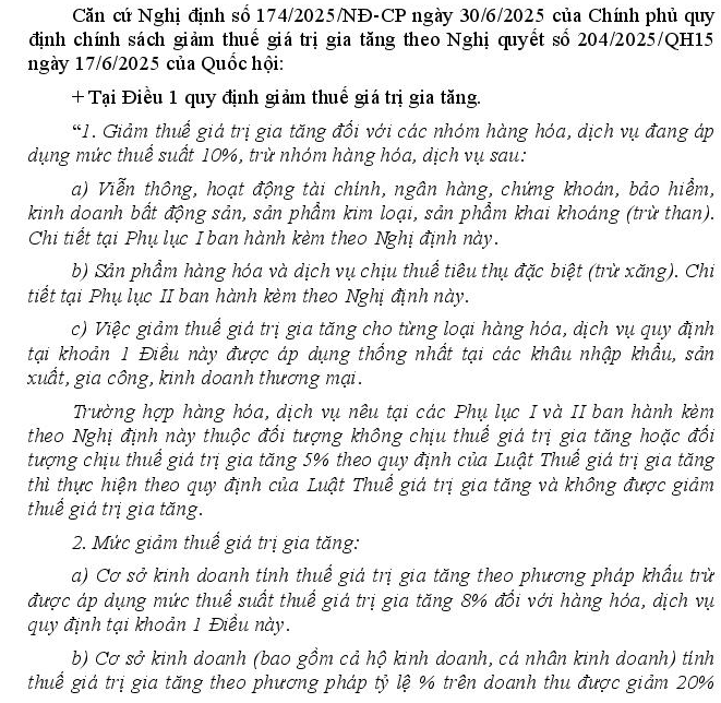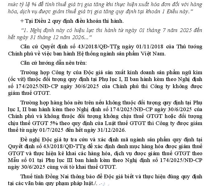 Kính gửi Bộ Tài Chính. Công ty chúng tôi mã ngành chính: 3290 ( Sản xuất khác chưa được phân vào đâu)- Sản phẩm : ngũ kim (ốc vít) Theo NQ204/2025/QH15: Giảm 2% thuế suất thuế giá trị gia tăng, áp dụng đối với các nhóm hàng hóa, dịch vụ quy định tại khoản 3 Điều 9 Luật Thuế giá trị gia tăng 2024 (còn 8%), trừ một số nhóm hàng hóa, dịch vụ sau: viễn thông. hoạt động tài chính, ngân hàng, chứng khoán, bảo hiểm, kinh doanh bất động sản, sản phẩm kim loại, sản phẩm khai khoáng (trừ than), sản phẩm hàng hóa và dịch vụ chịu thuế tiêu thụ đặc biệt (trừ xăng). Nhưng trong phụ lục NĐ 174/2025/NĐ-CP các mã ngành không được giảm thuế" không có mã ngành mà công ty đăng ký. Trong trường hợp này, Công ty chúng tôi nên xuất hóa đơn VAT 10% hay 8% ? Xin chân thành cảm ơn !