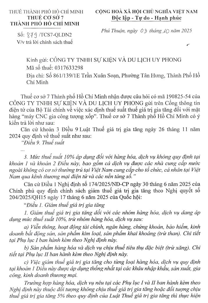 Kính gửi: Thuế Thành Phố Hồ Chí Minh - Doanh nghiệp có MST 0317633298, ngày 09/07/2025 có đặt cọc mua 01 máy CNC gia công tượng xốp của CÔNG TY TNHH DỊCH VỤ THƯƠNG MẠI KỸ THUẬT MAI LINH (MST: 0317888842), mã ngành chính 4659 Bán buôn máy móc, thiết bị và phụ tùng máy khác. Chi tiết: Bán buôn máy móc, thiết bị và phụ tùng máy khai khoáng, xây dựng; Bán buôn máy móc, thiết bị điện, vật liệu điện (máy phát điện, động cơ điện, dây điện và thiết bị khác dùng trong mạch điện); Bán buôn máy móc, thiết bị và phụ tùng máy dệt, may, da giày; Bán buôn máy móc, thiết bị và phụ tùng máy văn phòng (trừ máy vi tính và thiết bị ngoại vi); Bán buôn máy khắc CNC (khắc gỗ, cắt quảng cáo khắc đá, đồng), máy khắc laser, máy quét 3D, máy cắt plasma, máy cắt CNC, mắt cắt laser. - Doanh nghiệp muốn hỏi về thuế suất của mặt hàng máy móc CNC này là chịu thuế suất (8% hay 10%) vì người bán có thông báo là do linh kiện nhập khẩu với thuế suất 10% nên hóa đơn bán ra của máy CNC này cũng là 10% mà không được hưởng ưu đãi về thuế GTGT theo Nghị quyết 204/2025/QH15, Nghị định 174/2025/NĐ-CP thì có đúng qui định không? - Khi tra cứu sản phẩm, hàng hóa, dịch vụ có được hưởng ưu đãi về thuế GTGT hay không thì doanh nghiệp sẽ dựa vào mã ngành hay sản phẩm cuối cùng, hay dựa vào tiêu chí nào khác để có thể tra cứu thông tin chính xác nhất. Rất mong cơ quan thuế có văn bản hoặc ý kiến hướng dẫn để doanh nghiệp thực hiện đúng nghĩa vụ thuế và đúng quy định pháp luật hiện hành, nhằm tạo điều kiện thuận lợi trong công việc kê khai, đối chiếu thuế. Xin trân trọng.