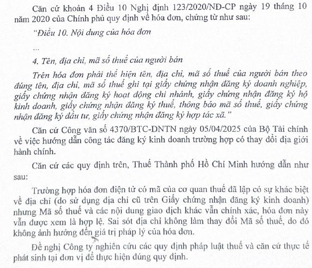 Ngày 10/07/2025, Bộ Tài Chính, Cục Thuế ban hành công văn số 2376/CT-NVT về việc sử dụng thông tin địa chỉ của doanh nghiệp sau khi thay đổi địa giới hành chính. Cụ thể: Địa chỉ của người nộp thuế xác định theo Giấy chứng nhận đăng ký kinh doanh còn hiệu lực và địa chỉ do cơ quan thuế cập nhật tương ứng theo địa bàn hành chính 2 cấp đều có giá trị pháp lý để sử dụng ghi trên hóa đơn. Do đó: Trường hợp thông tin địa chỉ của doanh nghiệp đã được cơ quan thuế cập nhật theo địa bàn hành chính 2 cấp tương ứng nhưng chưa đồng bộ sang hệ thống hóa đơn điện tử thì thông tin địa chỉ trên hóa đơn là thông tin địa chỉ trên Giấy chứng nhận đăng ký doanh nghiệp.