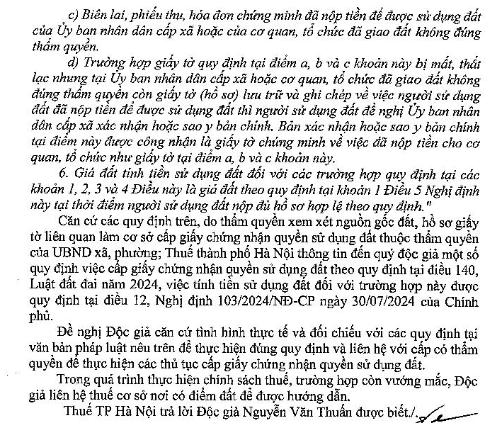 Kính gửi: Bộ Tài chính Từ năm 1990 đến nay, Bộ Tài chính đã ban hành các quy định liên quan đến việc ghi nợ tiền sử dụng đất đối với các trường hợp Nhà nước giao đất có thu tiền sử dụng đất nhưng người được giao đất chưa nộp hoặc nộp chưa đủ tiền sử dụng đất, cũng như việc thông báo hàng năm về số tiền sử dụng đất còn nợ của người được Nhà nước giao đất? Hiện nay phát sinh trường hợp như sau: Các Phiếu thu tiền sử dụng đất lập vào các năm 1990, 1991 chỉ có chữ ký của Thủ quỹ và cán bộ thanh toán, không có dấu của cơ quan thu tiền, nhưng lại được ghim kèm “tích kê” có ghi rõ số hiệu thửa đất, cùng chữ ký và dấu của cơ quan giao đất. Đến nay, cơ quan giao đất và cơ quan thu tiền sử dụng đất thời điểm đó đã giải thể, do đó người được giao đất không còn khả năng tìm lại nhân chứng để xác nhận các giấy tờ đó. Trong tình huống nêu trên, đề nghị Bộ Tài chính hướng dẫn về việc xử lý số tiền sử dụng đất thể hiện trên Phiếu thu như thế nào, khi thực hiện thủ tục đăng ký, cấp Giấy chứng nhận thì cơ quan chức năng xác định (tại thời điểm tháng 10/2025): toàn bộ diện tích đất thuộc hạn mức công nhận đất ở, nhưng là đất giao không đúng thẩm quyền. Rất mong Bộ Tài chính quan tâm sớm xem xét các nội dung nêu trên. Xin trân trọng cảm ơn!