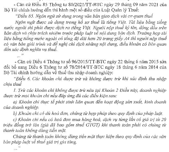 Kính gửi: Bộ Tài chính Tôi có vài câu hỏi liên quan đến thuế nhà thầu nước ngoài, mong Bộ Tài chính giải thích và hướng dẫn để tôi thực hiện đúng với quy định 1. Tôi có mua gói ChatGPT của OpenAI, các ứng dụng AI khác, thanh toán trực tuyến bằng thẻ Visa của công ty, nhưng không có hợp đồng kèm theo. Chứng từ điện tử gửi về bằng tiếng Anh, chỉ ghi tên công ty bằng chữ không dấu. Phía công ty có kê khai và nộp thuế nhà thầu đầy đủ. Vậy chúng tôi cần làm thủ tục gì để có thể hợp lý các chi phí từ những phát sinh trên? Với những chứng từ điện tử của NCC gửi bằng tiếng anh có được ghi chi phí hợp lý, hợp lệ không? 2. Về gói ChatGPT của OpenAI, trước 1/8/2025 họ không có mst ở VN nên chúng tôi vẫn kê khai thuế nhà thầu nộp thay Tuy nhiên từ 1/8/2025 OpenAI đã có mst nhà cung cấp nước ngoài ở Việt Nam, trên chứng từ cũng đã có thu thuế GTGT, chứng từ vẫn là chứng từ điện tử tiếng anh Chúng tôi muốn hỏi khi NCC nước ngoài đã có MST ở Việt Nam, có thu thuế VAT thể hiện trên chứng từ thì chúng tôi có cần thực hiện kê khai và nộp thuế nhà thầu nộp thay phần thuế TNDN nữa không?