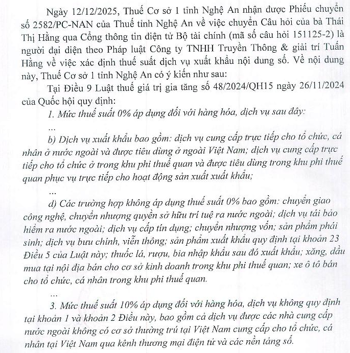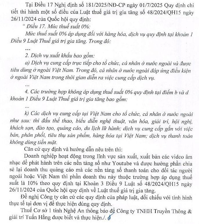 Kính chào Bộ Tài Chính, Công ty chúng tôi hiện có hoạt động kinh doanh như sau: 1. Bản chất dịch vụ: Công ty sản xuất và đăng tải nội dung số (video nhạc, video nội dung khác bằng tiếng nước ngoài…) lên nền tảng YouTube và hiển thị cho người xem ở nước ngoài. YouTube thực hiện lồng quảng cáo tự động và chia sẻ doanh thu thông qua Google AdSense, Công ty không quyết định quảng cáo nào hiển thị, không định giá quảng cáo. Người hưởng lợi cuối cùng là người xem và nhà quảng cáo (qua YouTube) Công ty không trực tiếp bán quảng cáo cho bất kỳ nhãn hàng hay tổ chức nào. Công ty chỉ cung cấp dịch vụ nội dung số (không liên quan đến quảng cáo) để người xem truy cập và tiêu dùng từ nước ngoài. 2. Thanh toán: Google/YouTube thanh toán qua ngân hàng, có chứng từ chuyển khoản. Nội dung được tiêu dùng chủ yếu bởi người dùng nước ngoài. 3. Vấn đề cần xác định: Doanh thu từ YouTube/AdSense có được xem là dịch vụ xuất khẩu nội dung số hay không? Trường hợp được xem là dịch vụ xuất khẩu, thuế suất GTGT áp dụng là 0%; nếu không, áp dụng mức thuế suất bao nhiêu? Hồ sơ, chứng từ cần thiết để chứng minh việc áp dụng thuế suất 0%. Chúng tôi kính mong Bộ Tài Chính hướng dẫn cụ thể để công ty thực hiện đúng quy định. Xin trân trọng cảm ơn!