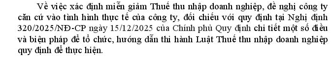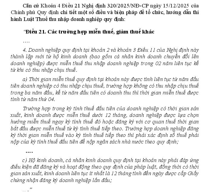 Kính gửi: Bộ Tài chính Theo Luật số 67/2025/QH15 của Quốc hội ban hành ngày 14/06/2025 có hiệu lực từ 01/10/2025, áp dụng cho kỳ tính thuế 2025 trở đi. Công ty chúng tôi chuyển đổi từ hộ kinh doanh lên Công ty ngày 13/05/2025. Tức là Công ty chuyển đổi trước ngày ban hành luật số 67/2025/QH15 và trước ngày luật có hiệu lực là ngày 01/10/2025. Nhưng luật số 67/2025/QH15 có câu áp dụng cho kỳ tính thuế 2025 trở đi. Vì thế chúng tôi không biết Công ty của mình có thuộc diện miễn giảm thuế TNDN 2 năm không?