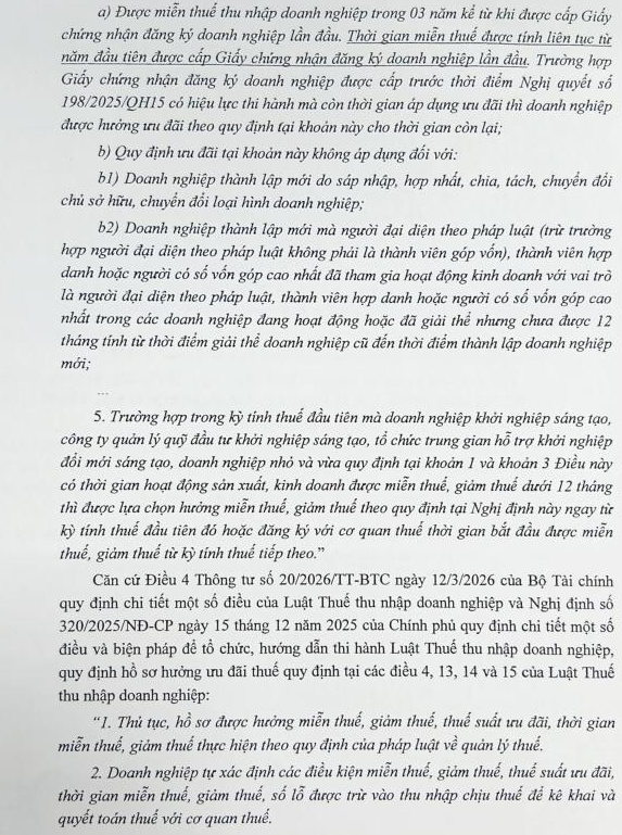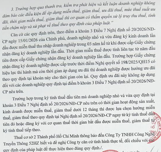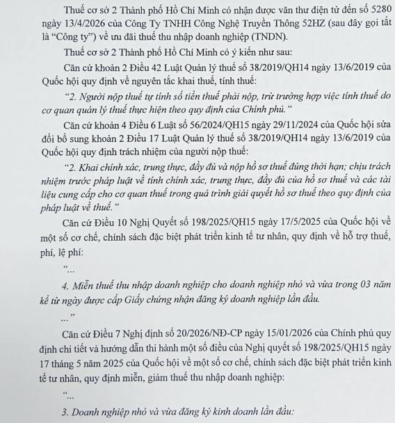 Kính gửi: Bộ tài chính Tên doanh nghiệp: Công Ty TNHH Công Nghệ Truyền Thông 52HZ Mã số thuế: 0317822908 Địa chỉ trụ sở: 783/30/58D Nguyễn Duy Trinh, Phường Phú Hữu, Thành phố Hồ Chí Minh Căn cứ quy định tại Nghị định số 20/2026/NĐ-CP (hướng dẫn Nghị quyết số 198/2025/QH15) về việc miễn thuế Thu nhập doanh nghiệp (TNDN) 03 năm đối với doanh nghiệp nhỏ và vừa. Theo quy định pháp luật về thuế TNDN và tinh thần của Nghị định nói trên: Trường hợp kỳ tính thuế năm đầu tiên của doanh nghiệp không đủ 12 tháng, doanh nghiệp có quyền lựa chọn hưởng miễn thuế ngay năm đó, hoặc đăng ký với cơ quan thuế để nộp thuế năm đầu và bắt đầu tính thời gian miễn thuế trọn vẹn 03 năm từ năm tiếp theo. Công ty chúng tôi thành lập vào ngày 09/05/2023, do đó kỳ tính thuế năm đầu tiên 2023 không đủ 12 tháng. Công ty có nguyện vọng nộp thuế năm đầu và dời thời gian bắt đầu hưởng miễn thuế 03 năm sang kỳ tính thuế tiếp theo 2024,2025,2026. Tuy nhiên, khi Công ty liên hệ với Cơ quan thuế quản lý trực tiếp là Thuế cơ sở 2 - Thành phố Hồ Chí Minh, chúng tôi nhận được câu trả lời là "hiện tại không có thủ tục này" và chưa được hướng dẫn cách thức thực hiện để đảm bảo quyền lợi hợp pháp của doanh nghiệp. Để có cơ sở thực hiện đúng pháp luật, tránh rủi ro vi phạm thủ tục hành chính hoặc mất quyền lợi ưu đãi chính đáng, Công ty kính đề nghị Bộ Tài Chính có văn bản hướng dẫn rõ các nội dung sau: Để thực hiện quyền lựa chọn lùi thời gian hưởng ưu đãi miễn thuế 03 năm sang năm tiếp theo theo đúng quy định, Công ty cần thực hiện thủ tục đăng ký như thế nào? Cơ quan Thuế có ban hành biểu mẫu đăng ký nào cho việc này không? Nếu không có biểu mẫu quy định sẵn và không có thủ tục đăng ký riêng biệt, Công ty chỉ cần tự làm Công văn thông báo gửi Cơ quan thuế quản lý trực tiếp, đồng thời tự xác định trên Tờ khai quyết toán thuế TNDN cuối năm có được coi là hợp lệ và đúng quy định không? Kính mong Quý Cơ quan sớm xem xét và có văn bản trả lời để Công ty chúng tôi kịp thời thực hiện. Trân trọng cảm ơn!
