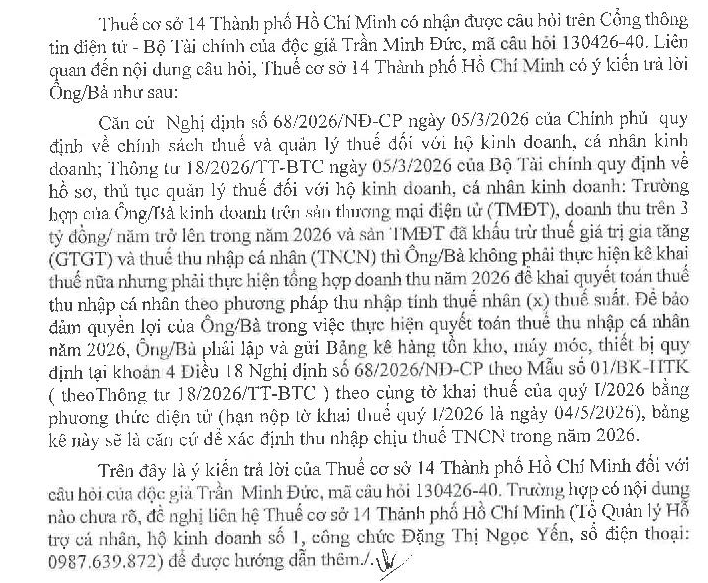 Kính gửi Bộ Tài Chính , Cục Thuế TPHCM . Tôi là cá nhân kinh doanh có hoạt động kinh doanh 100% trên sàn Thương Mại Điện Tử có chức năng thanh toán ( Shoppe , Tikok Shop ) . Mặt hàng tôi bán là quần áo nam mua tại các chợ xưởng việt nam . Trước năm 2025 tôi nộp thuế theo PP kê khai là thuế GTGT 1% và TNCN 0.5% . Và tôi không có lấy hóa đơn đầu vào khi mua hàng . Đến 2026 , tôi có doanh thu năm trên 3 tỷ nên phải kê khai theo phương pháp Thu nhập tính thuế = Doanh thu - Chi phí x 17%. tôi được biết theo Nghị Định mới của nhà nước là Hộ Kinh Doanh được lập bảng kê Mẫu số: 01/BK-HTK (Kèm theo Thông tư số 18/2026/TT-BTC ngày 05/3/2026 của Bộ trưởng Bộ Tài chính) . Để được xác định chi phí được trừ khi quyết toán thuế TNCN . Nhưng cán bộ quản lý thuế tại cơ sở 14 không đồng ý và nói tôi không được trừ vì không có hóa đơn của trước năm 2025 . Vậy cho tôi hỏi là chi phí khi mua hàng của tôi trước năm 2025 tôi phải làm sao . Tôi cảm ơn